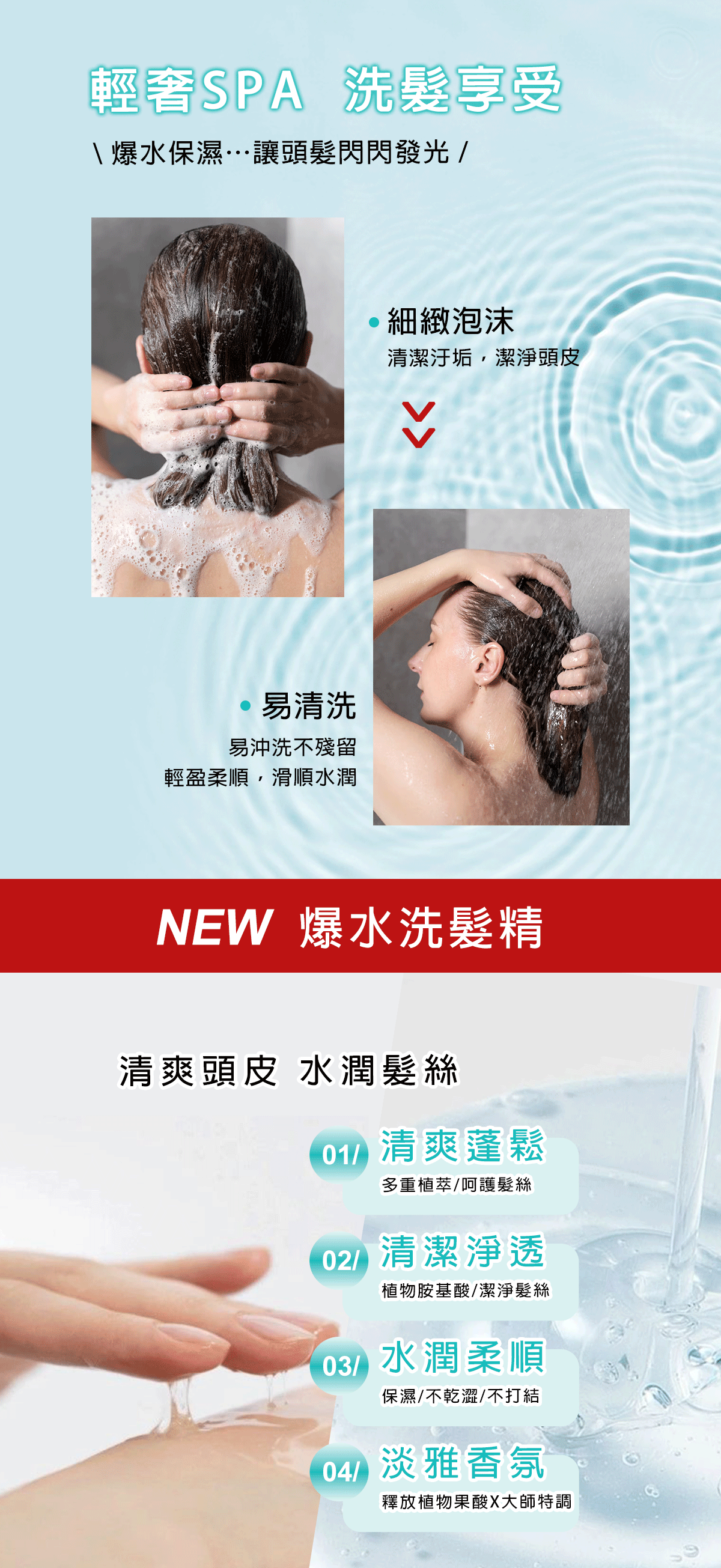 告別乾枯毛躁,從"爆水"洗髮開始!溫和洗淨髮絲髒污,注入多重保濕精華,深層滋養髮芯。洗後髮絲柔順不乾澀,在家輕鬆享受沙龍級護髮體驗。